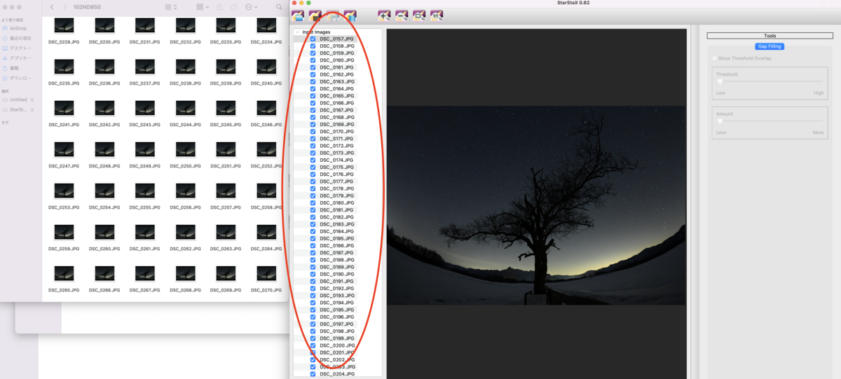 自分はStar Staxというフリーソフトを使用して比較明合成をしています。起動するとこんな感じの画面が開きまして〇で囲ったところに合成したい写真をドロップすると合成できます。