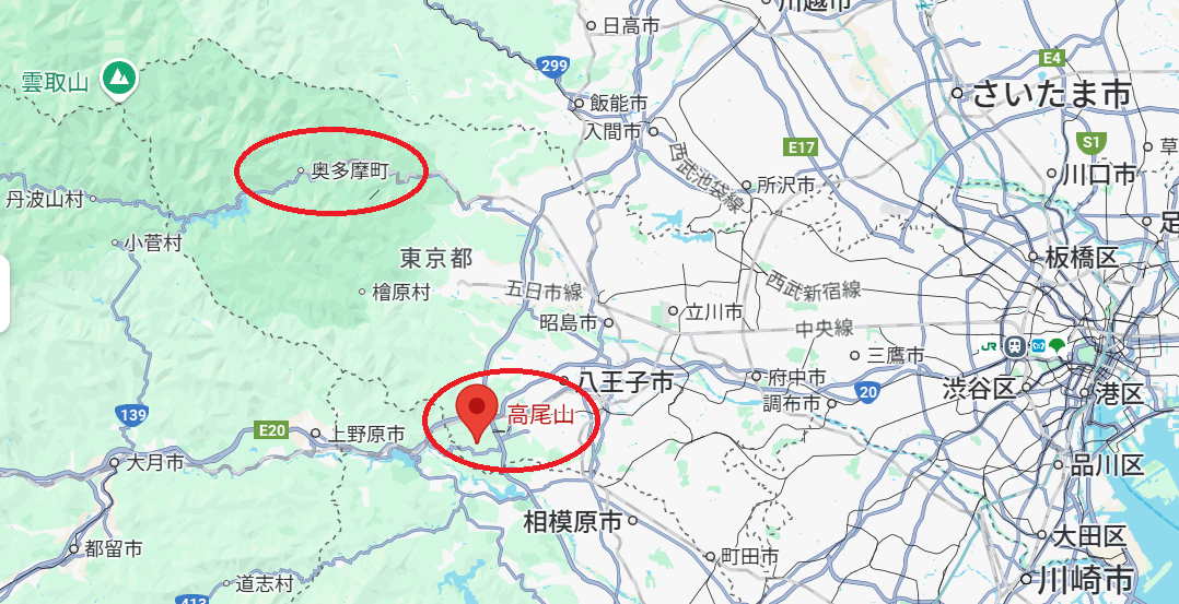新宿駅から青梅駅まで1時間強。その後、青梅から奥多摩まで1時間弱です。地図で言うとこんな感じです。矢印の破線が埼玉 (秩父) や山梨との県境なので、まさに東京の端っこと言っていいでしょう。