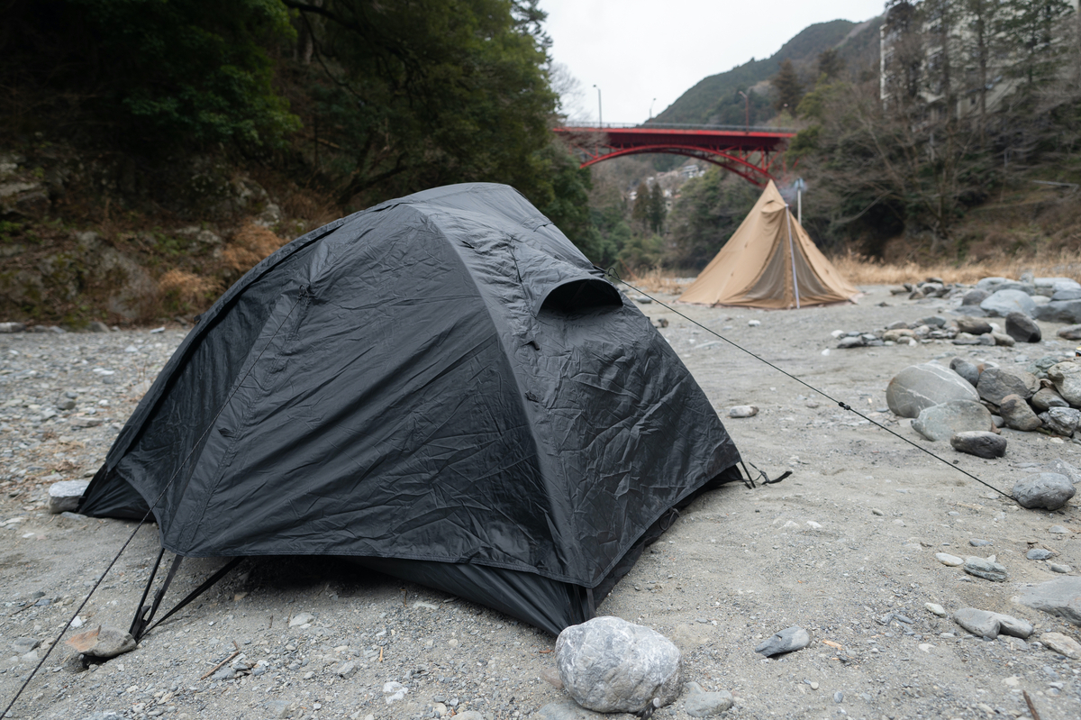 河原に降りて設営完了!!計画段階から、さっき渡ってきた橋が見えるところに設営できたらいいなぁと思っていたのでラッキーでした。今回は徒歩キャンプだから荷物の軽量化のためハンマー入っていなくて、河原の石でペグを打ち込んで、さらに河原の石を載せて飛んでいかないように工夫します💡